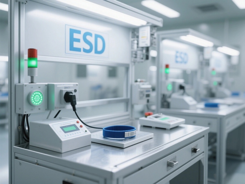 核心區域可見百級潔凈度的光刻車間,頂部密布FFU風機過濾單元,通過垂直層流控制微粒濃度(≤0.3μm顆粒每立方米<100個)。操作臺采用防靜電材質,配備離子風扇消除靜電干擾。?