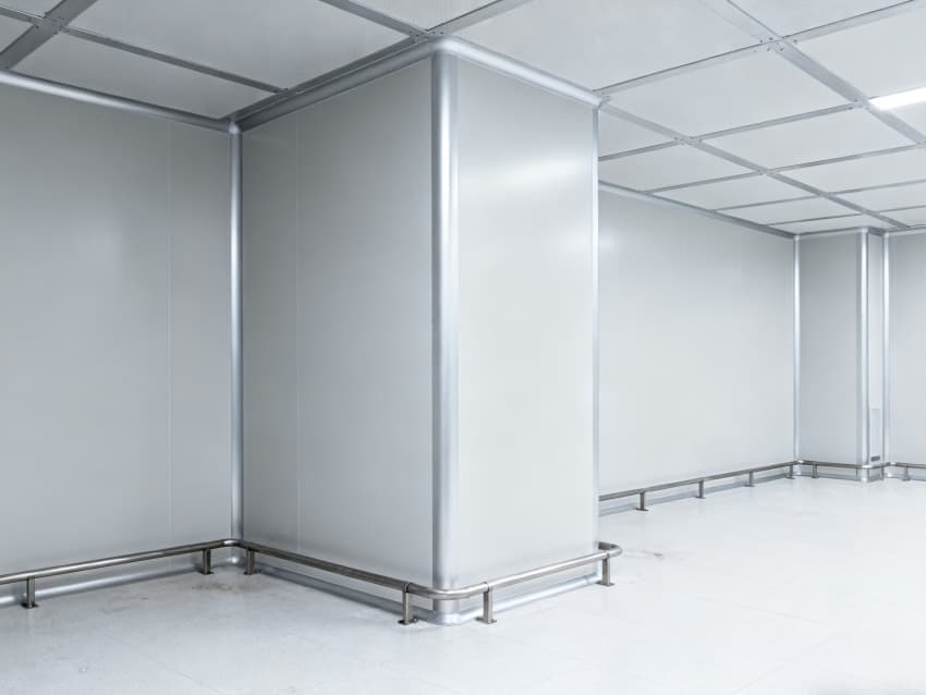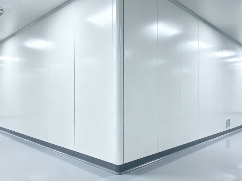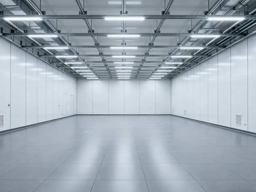 內部按功能劃分為六大核心區域:潔凈生產區采用無設備空曠布局,預留8-12米柱距滿足光刻機、刻蝕機等大型設備安裝需求;管線集成區通過規整的頂部管線橋架系統,實現水、電、氣、真空系統集中管控,減少管線交叉干擾;潔凈緩沖區設置于生產區入口,搭配墻面通風口保障潔凈度過渡;設備預留區保留開闊橫向空間,支持后期工藝動線調整;結構輔助區通過角落加固設計,滿足重型設備承重需求;墻面潔凈區采用光滑防污材質,降低粉塵附著率。整體空間兼顧半導體生產的潔凈標準與功能靈活性,適配合肥半導體產業發展需求。