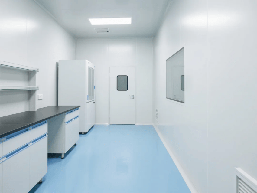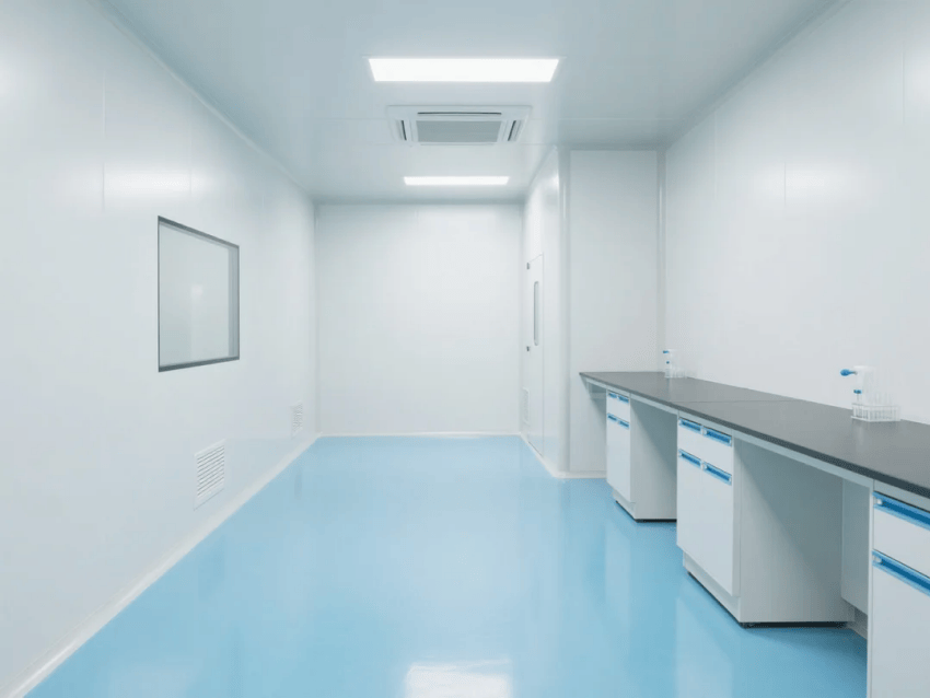 本方案采用生物科技極簡風(fēng)格,嚴(yán)格遵循ISO14644-1Class6潔凈標(biāo)準(zhǔn)。空間以純白抗菌彩鋼板墻體與淺藍(lán)環(huán)氧樹脂地坪構(gòu)建主體框架,營造純凈、高效的檢測環(huán)境。墻體采用50mm厚醫(yī)療級(jí)抗菌彩鋼板,所有接縫處采用R30mm圓弧處理工藝,確保無衛(wèi)生死角。淺藍(lán)環(huán)氧地坪添加防滑顆粒,摩擦系數(shù)≥0.6,同時(shí)具備優(yōu)異的耐化性。