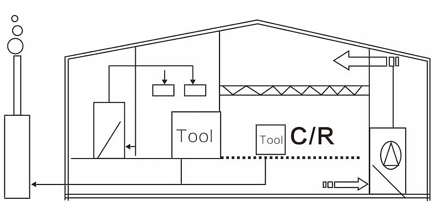 2、單夾層、集中送風(fēng)、上夾層為靜壓箱.