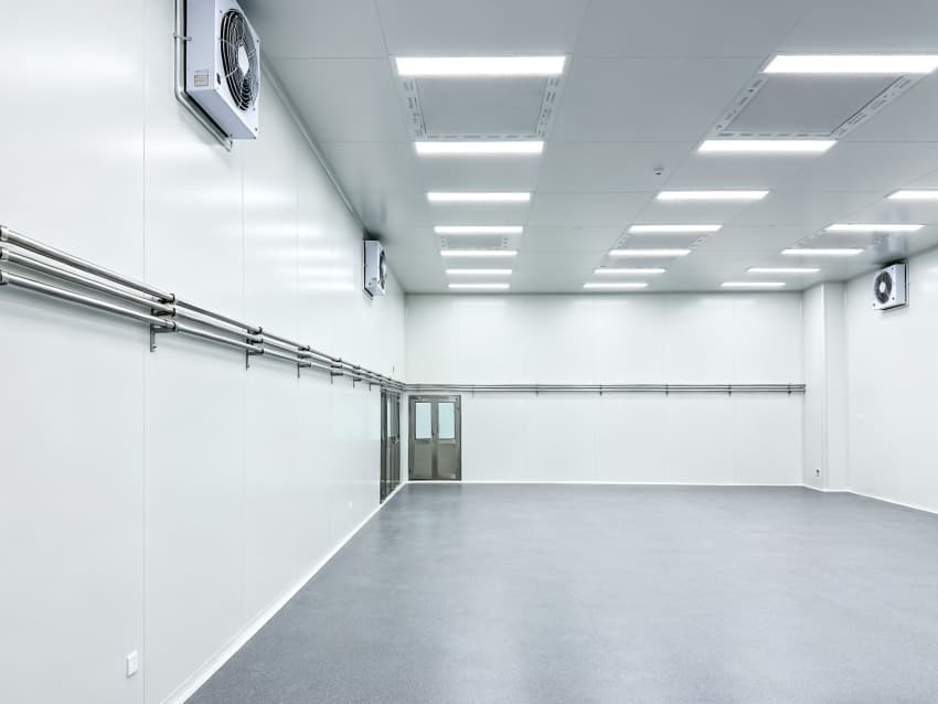 內部6個生產車間均為無設備空曠布局,按百級潔凈標準建設:地面鋪設防靜電環(huán)氧自流平,墻面采用無顆粒潔凈彩鋼板,陰陽角做R30圓弧處理杜絕積塵;柱網間距設為9米,預留光刻機、晶圓檢測設備等重型設備安裝點位;頂部整合恒溫恒濕系統(tǒng)、高效空氣過濾器及防頻閃LED照明,所有管線暗藏于吊頂內,最大化釋放空間高度,為芯片晶圓制造、封裝測試等核心環(huán)節(jié)提供超潔凈、高穩(wěn)定的專屬生產環(huán)境。