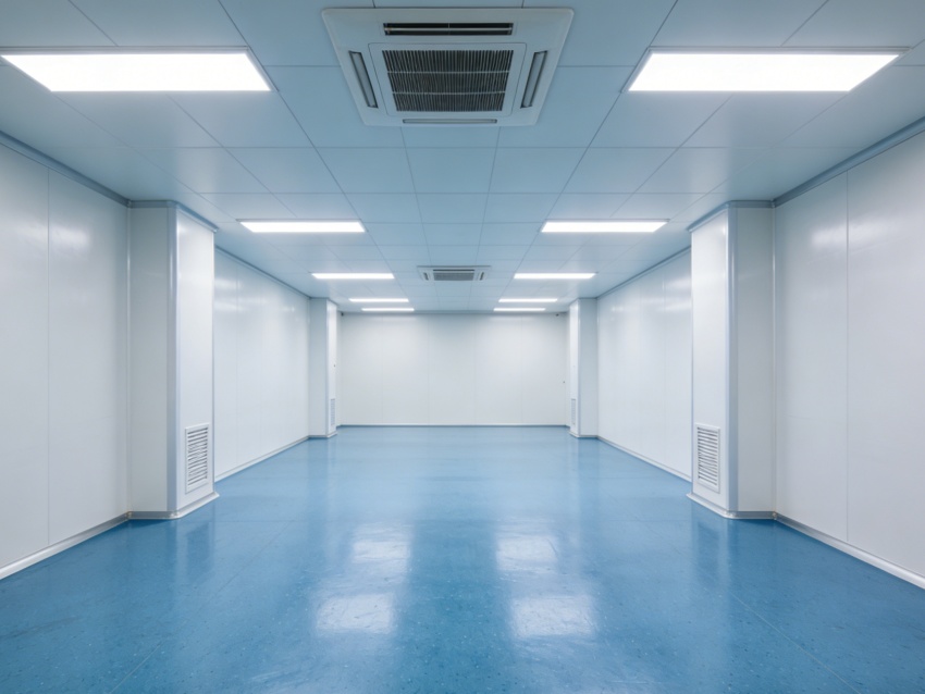 本次呈現的廠房電子光學車間,整體風格簡約專業,精準匹配電子光學器件研發與生產的核心需求。廠房外立面采用淺灰色工業基材搭配大面積高透玻璃幕墻,既保障建筑密封性與隔音性,又為內部車間引入充足自然光,外觀簡潔大氣且兼具工業質感與科技感。均以藍色防靜電潔凈地坪搭配白色無縫潔凈墻面。藍色地面選用高耐磨環氧材質,具備10?-10?Ω防靜電性能,可有效規避靜電對光學元件的損害,表面啞光處理減少光線反射;白色墻面采用環??咕繉?,無縫拼接設計消除清潔死角,搭配嵌入式防眩光照明,營造穩定的視覺環境。