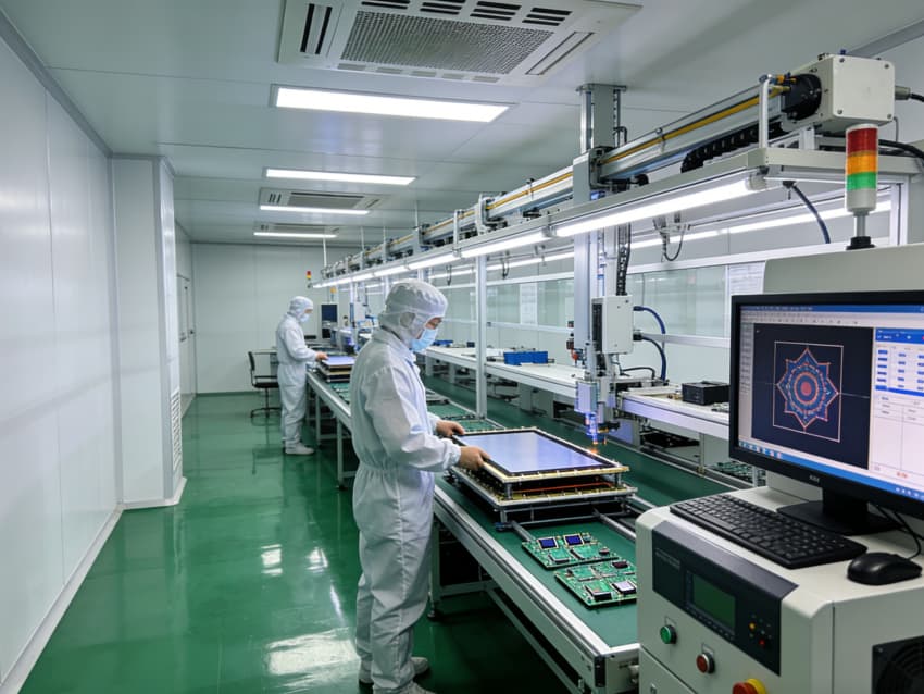 白色墻面采用工業級高潔凈涂層,推行無縫拼接工藝,陰陽角采用圓弧倒角設計,徹底消除積塵死角,保障潔凈度達標。廠房科學劃分陣列區、成盒區、模組組裝區等核心區域,陣列區配備百級層流凈化與高精度恒溫恒濕系統,成盒區設置無菌防護隔離裝置,各區域均預留智能生產設備接口與專用管線通道,全方位保障顯示器件生產的精準性與穩定性。
