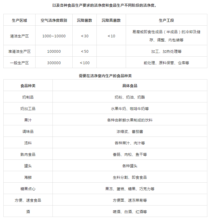 3、清潔作業(yè)區(qū)(潔凈室):指衛(wèi)生環(huán)境要求最高,人員、環(huán)境要求較高,必須經(jīng)過消毒和更衣才可以進入,如:原料、成品裸露的處理區(qū)域,食食品的冷加工間、即食食品的冷卻間、待包裝即食食品的儲存間、即食食品的內(nèi)包裝間等。食品廠不同生產(chǎn)區(qū)域和空氣潔凈度等級