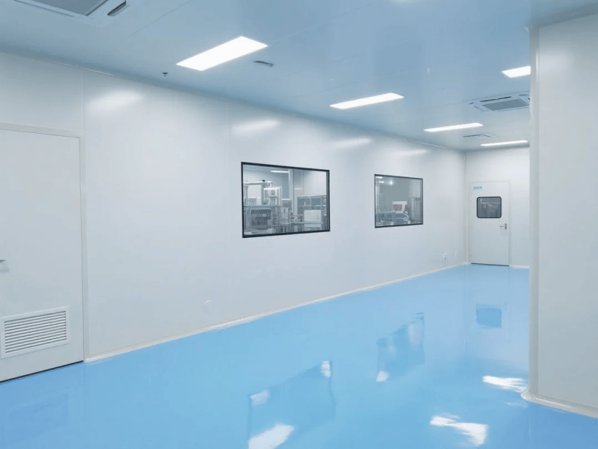 本工程嚴格遵循ISO14644-1Class7及GMP醫療器械生產規范,打造高標準的生物醫療器械制造環境。車間采用醫療級白色抗菌彩鋼板與淺藍防靜電環氧地坪的潔凈配色方案,營造安全、精準的生產空間。